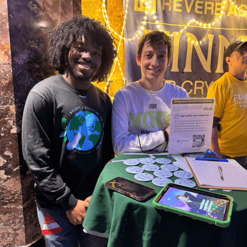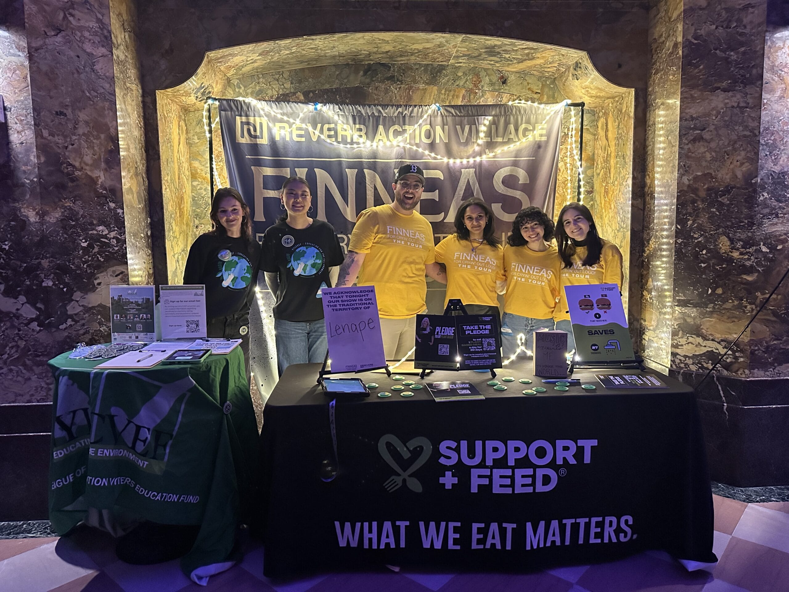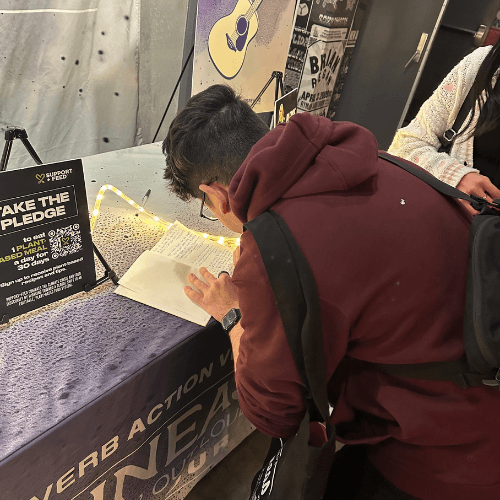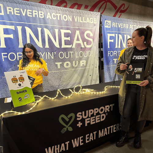 At one of FINNEAS’ shows, our REVERB and Support + Feed volunteers set up near the main entrance and merch area, where fans stopped to talk about sustainability, plant-based living, and clean energy.