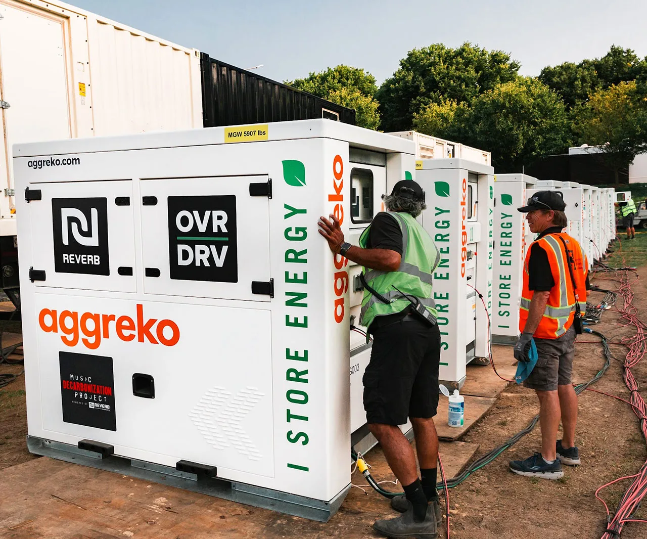 - The battery systems were fully charged by the on-site solar farm set up several days in advance of Billie’s set